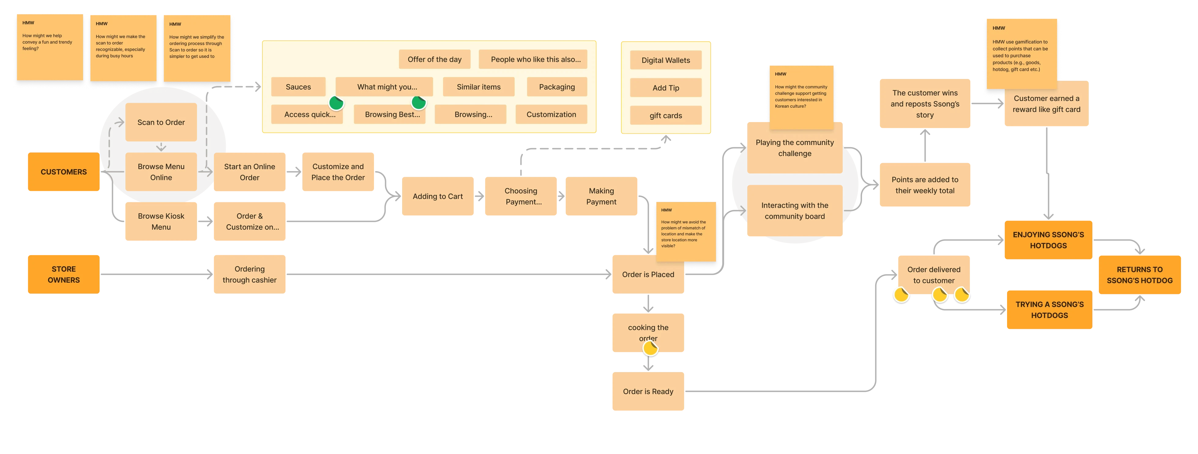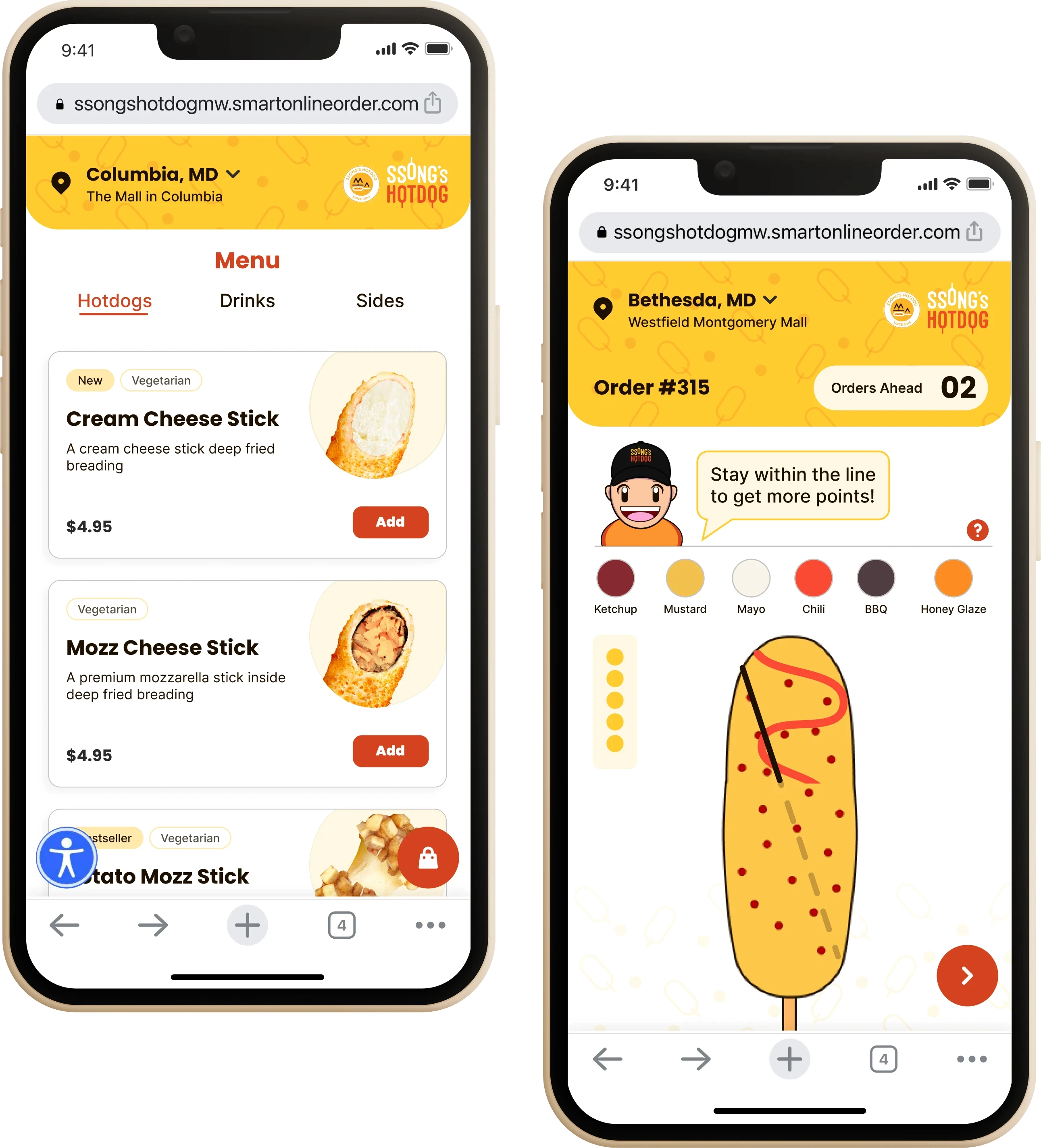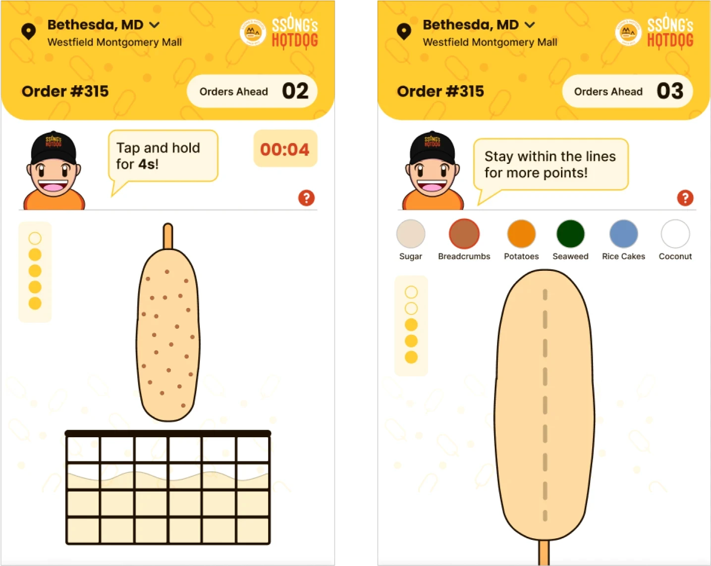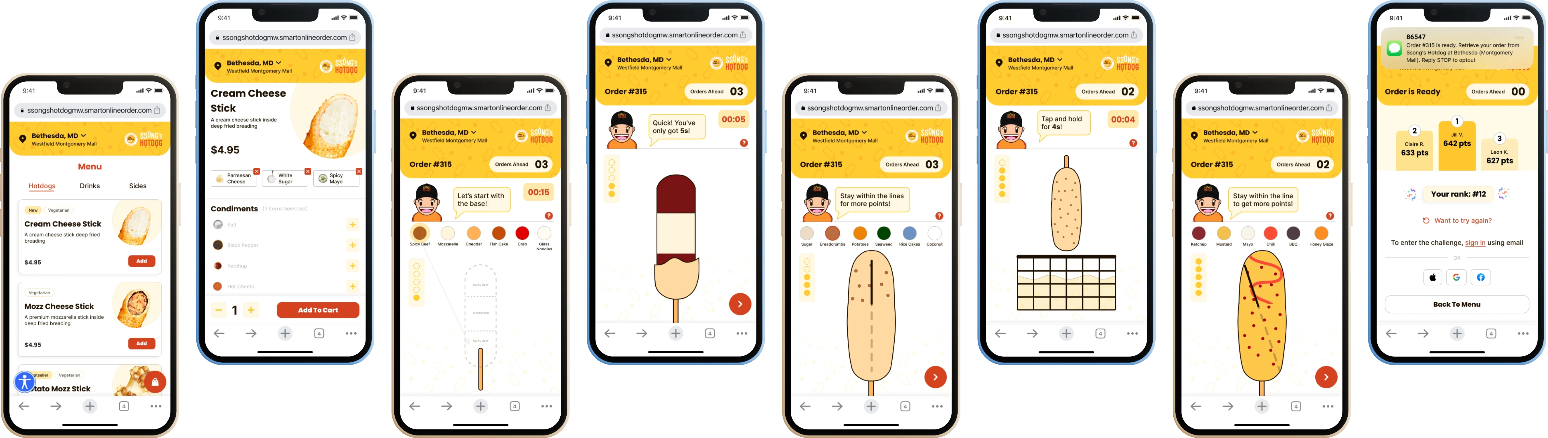 Ssong’s Hotdog is a Korean corndog brand with 15 branches across the United States and an international presence in Japan, China, and Vietnam. What sets Ssong’s apart is that their Hotdogs are freshly coated in batter and fried after ordering for a fresh taste. However, this process increases the order's wait time, especially during peak hours. Wait time and long queues play a crucial role in a saturated space of food courts for hungry, tired customers wanting to grab something quick. We address this by:
