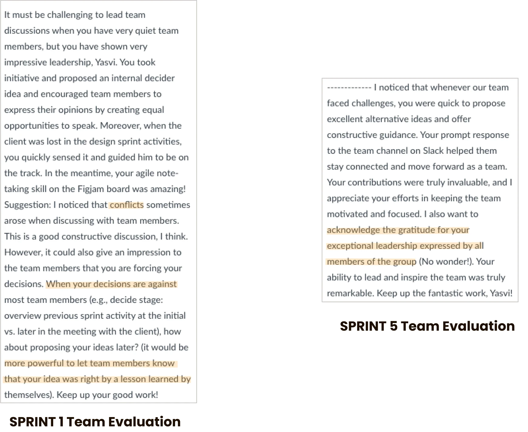 This was the first project where I used the Design Sprint Framework. Because of the iterative nature of the sprints, I had the opportunity to assume many roles (Facilitator, Prototyper, Interviewer) and identify my strengths and growth opportunities. The challenges I faced along with my team have not only left me with a better understanding of the non-linear design process but also highlighted the importance of adaptability, teamwork, and communication. Here is a glimpse of my team viewed my leadership evolved over the course of the project.