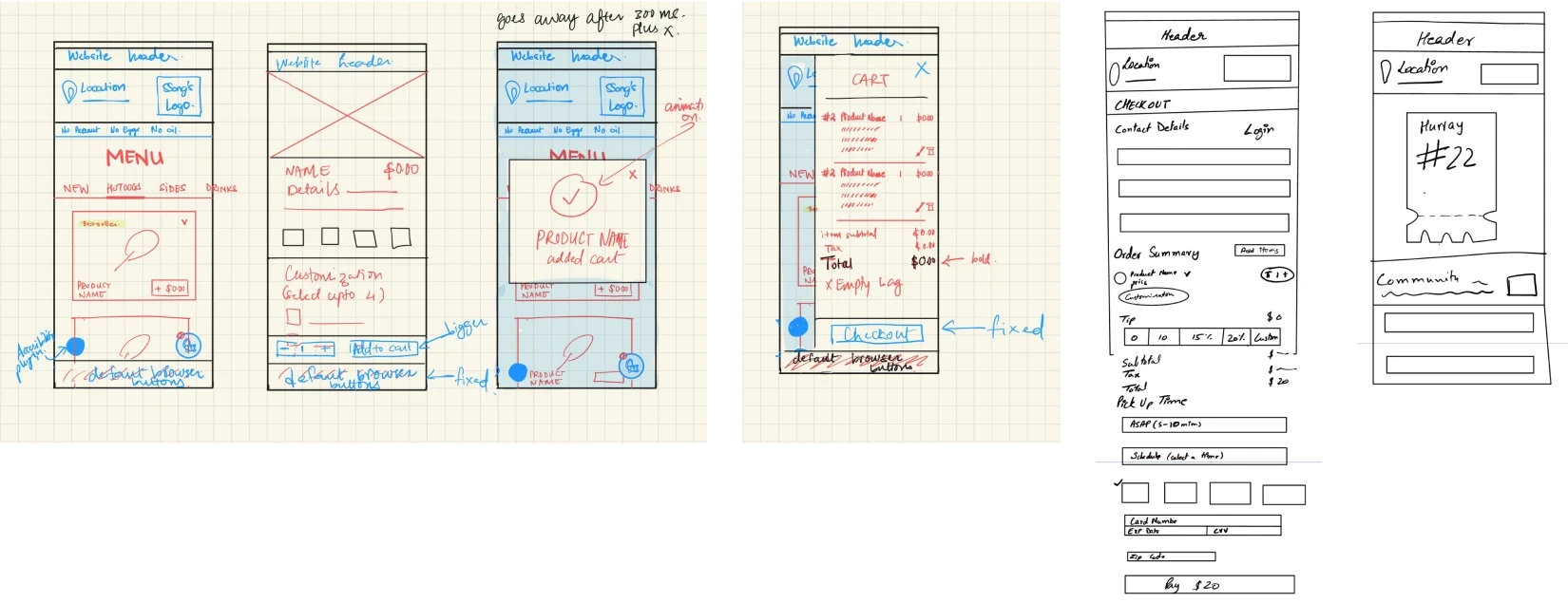 We individually sketched different ideas to increase the efficiency and trendy feel of the in-person ordering experience. In the wall walk where we presented our sketches, the team, and the client voted on testing my concept of a QR order system.